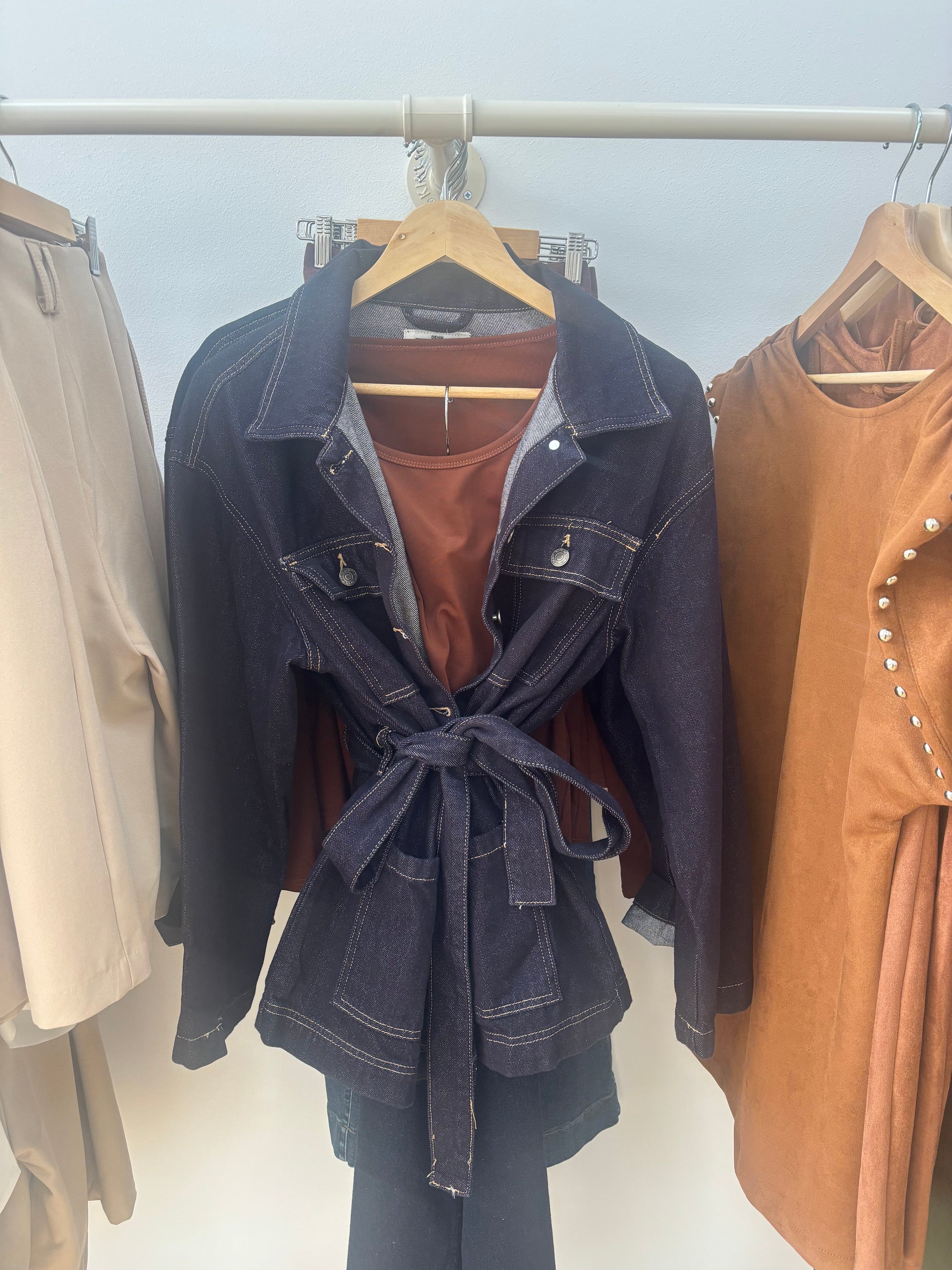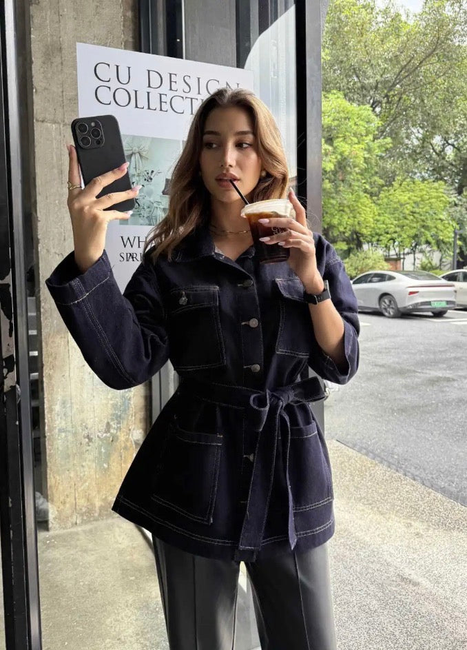 Chaqueta vaquera en color índigo oscuro con bolsillos y cinturón.