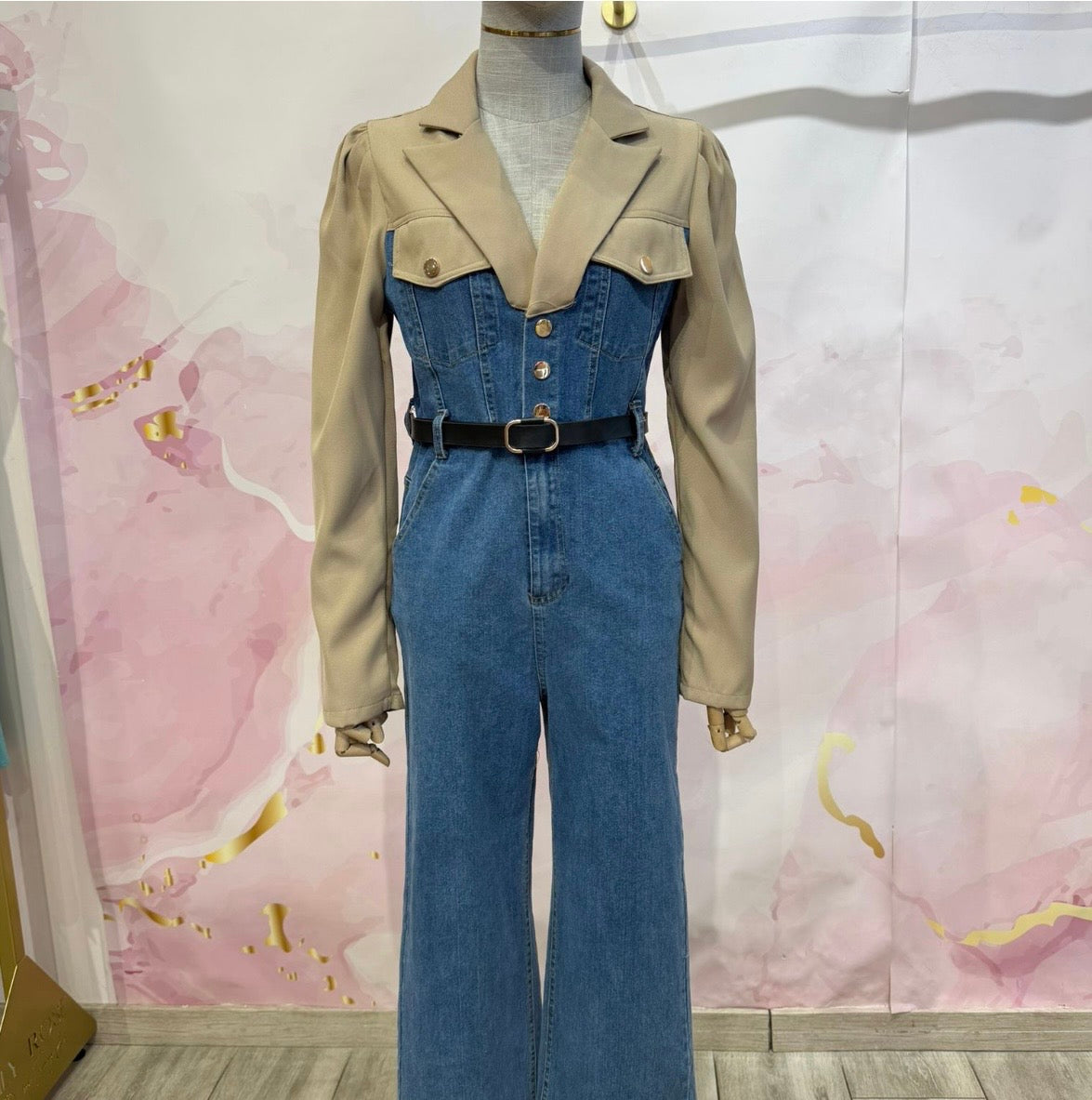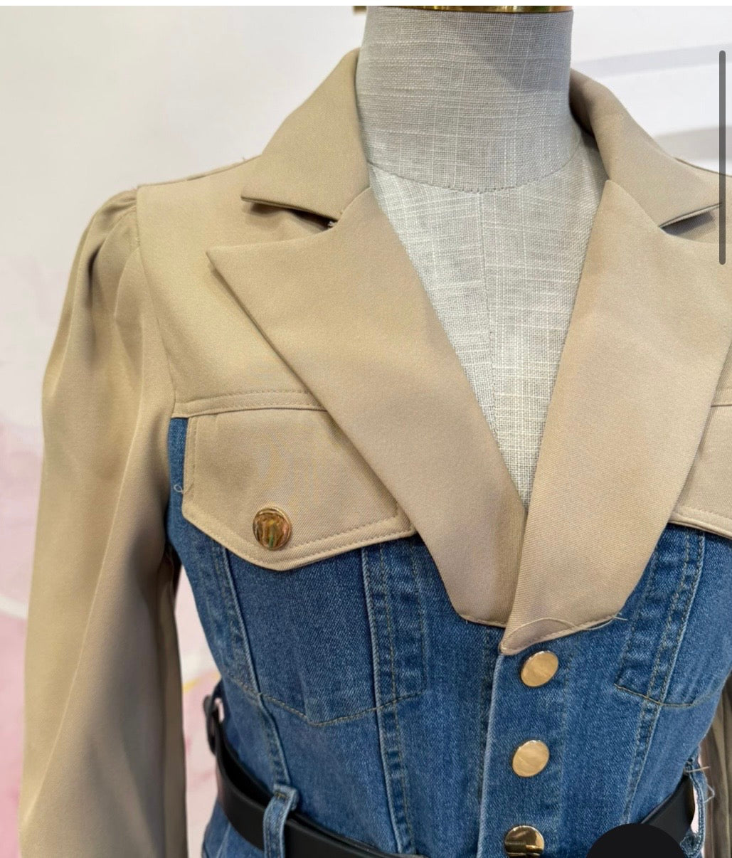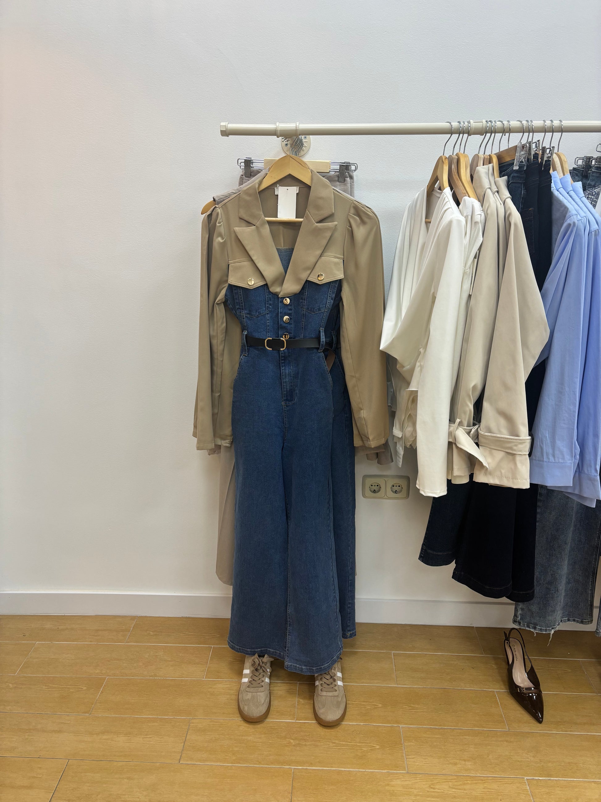 Mono vaquero efecto camisa,con botones dorados y cinturón.