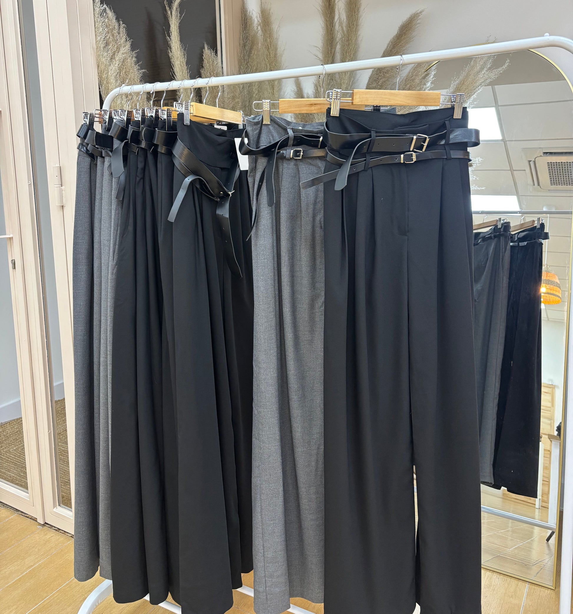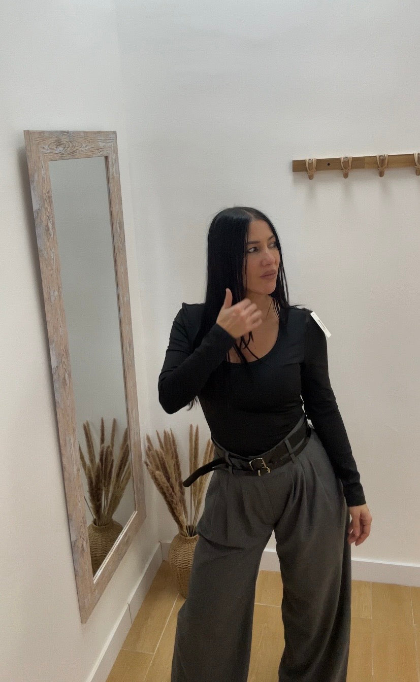 Pantalón palazo con pinzas bolsillos y doble cinturón.