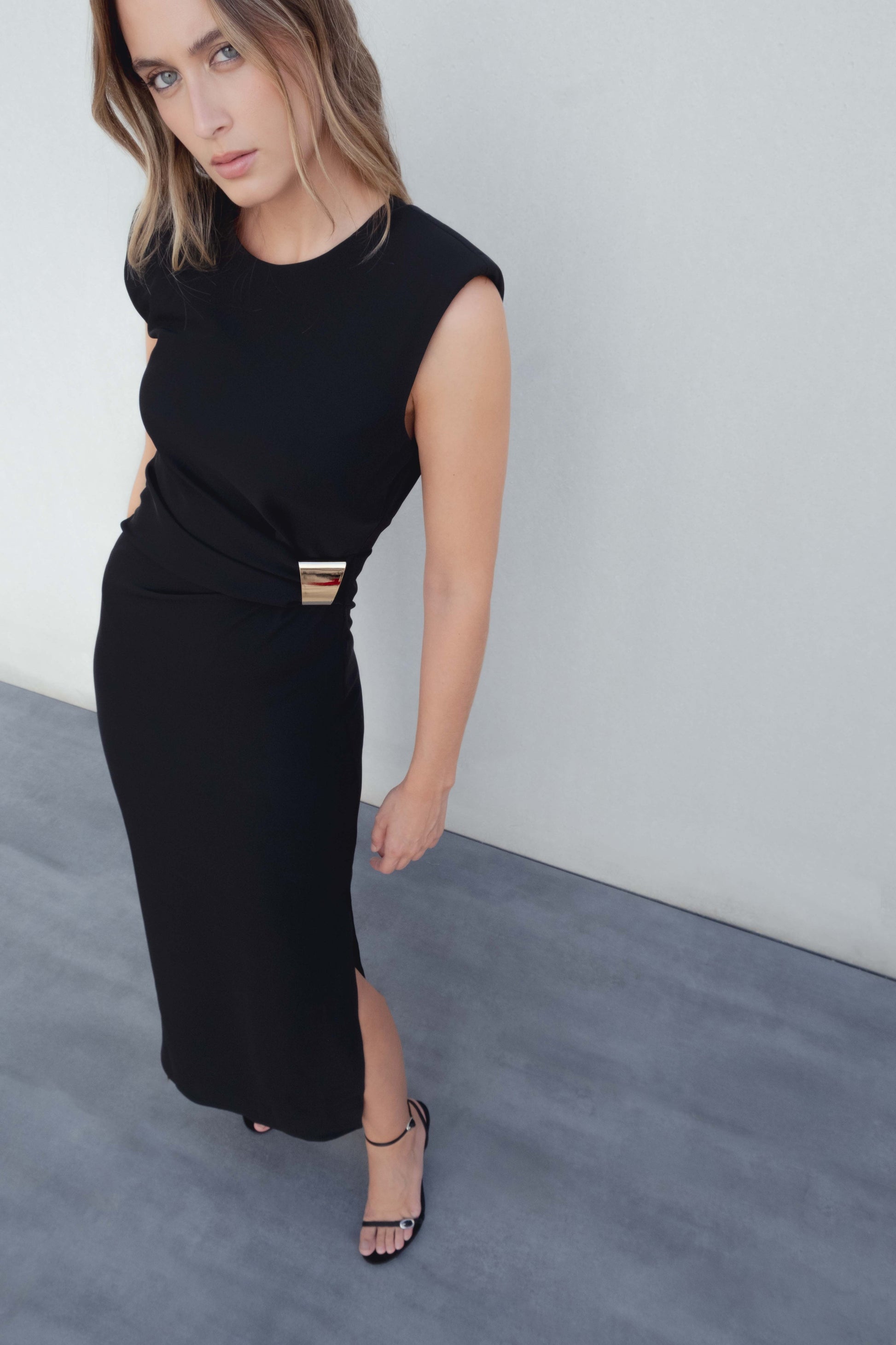 Vestido cuello redondo y manga sisa. Detalle de aplique dorado en cintura. Bajo con abertura lateral. Cierre en espalda con abertura y botón, y cierre lateral con cremallera oculta en costura.